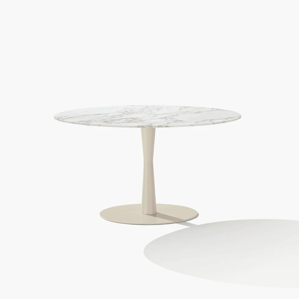 Flute is s small table for the most intimate occasions. It reinterprets a classic shape of design with personality, combining the thin and clean base like that of a stem glass, with a round top, to be customized with all available finishes, from mat and glossy lacquers to marble.