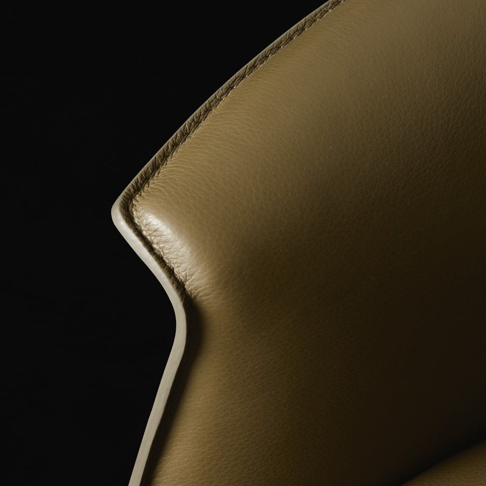 The Stanford Lounge armchair combines a swivel metal base with a high-backed seat, where the lines of the Stanford collection are rounded to become more welcoming. The special version with leather upholstery features a leather exterior and tone-on-tone leather interior.