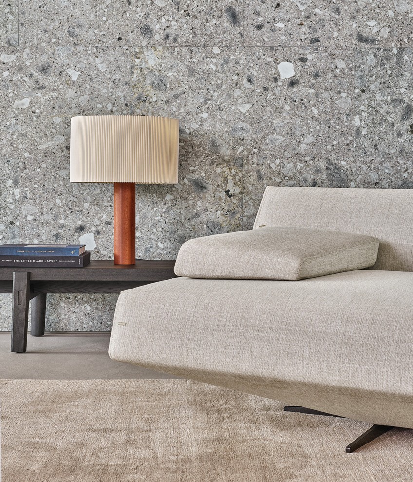 A contamination of styles, a mix of trends, perfect symmetry between oblique and orthogonal lines, sharp and rounded corners: Sydney’s design transforms a series of geometric volumes into a soft monocoque sofa. Sydney is distinguished by its slender feet and the L-shaped elements that make up the seat, which can be completed with freely arranged cushions of different sizes.